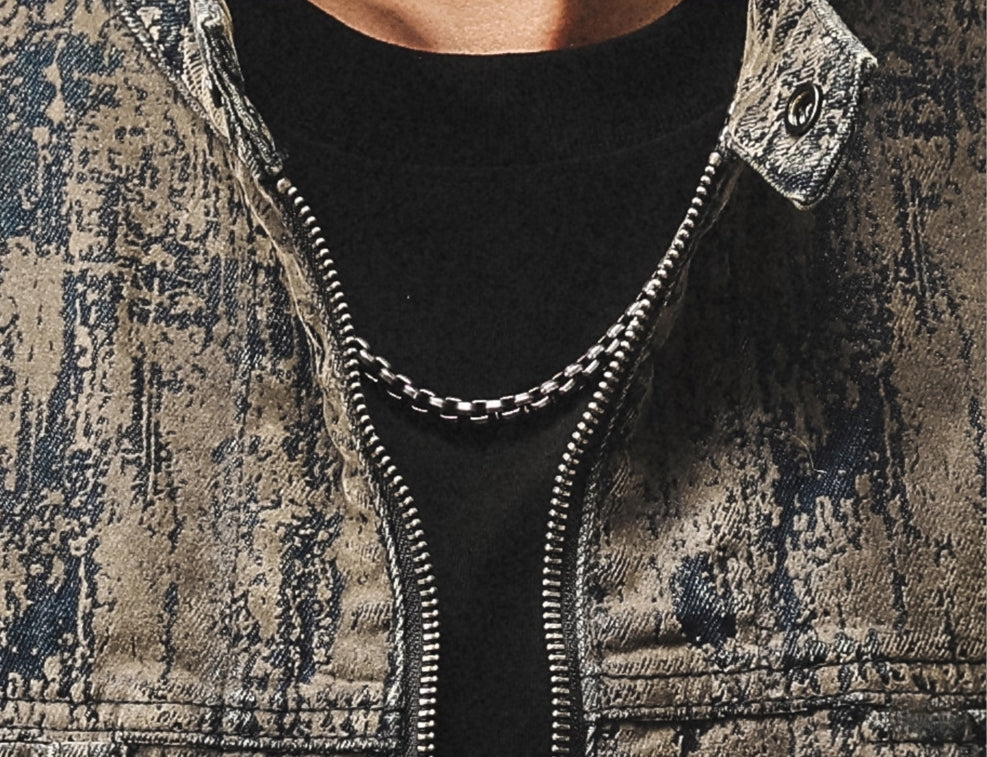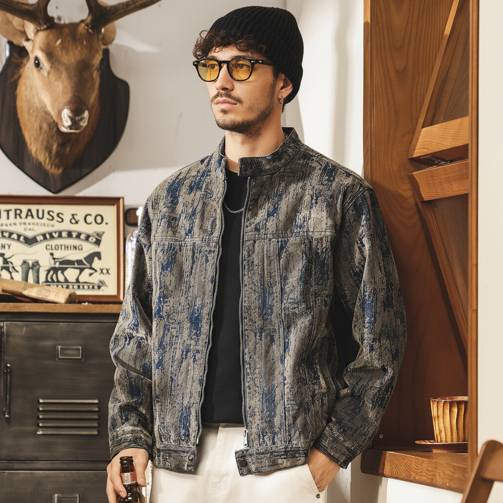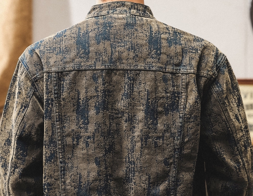 Washed Print Denim Stand-Collar Jacket